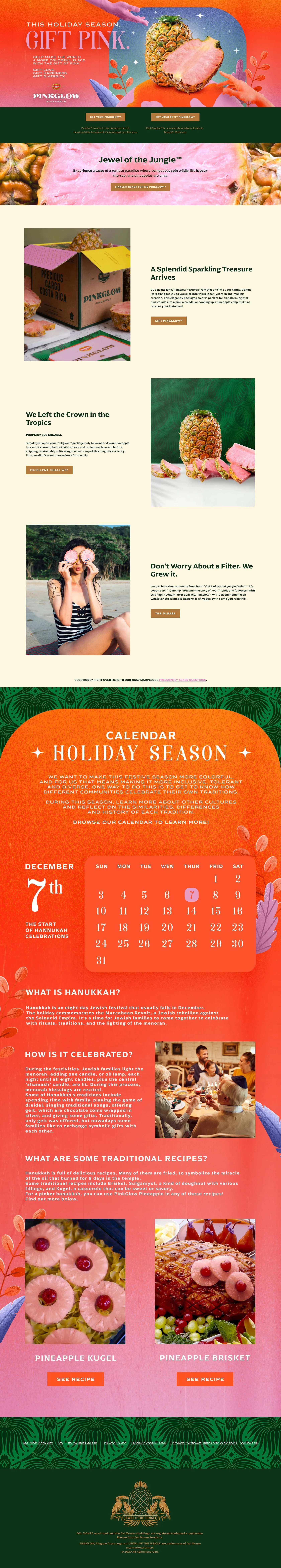 The key visual conveys diversity and inclusivity through a vibrant and exaggerated style. The playful and joyful use of colors evokes a sense of magic, happiness, and the euphoria typical of the festive season. There are traditions celebrated by thousands of people that are often misunderstood or receive little visibility in the media. The festive season is not limited to Christmas alone. To showcase other cultures, I created a calendar on the Pinkglow website that encourages the audience to learn how different parts of the world celebrate their holidays.