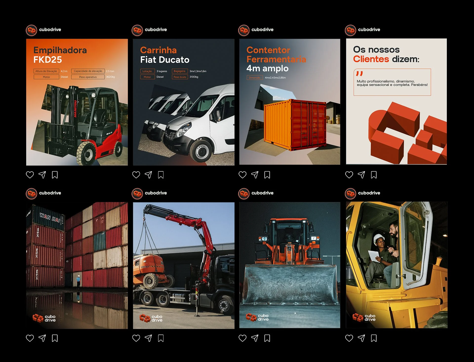 The new content strategy for Cubo Drive’s social media is anchored in three main pillars: showcasing key equipment through visually impactful posts with real photos and essential specs; revealing the behind-the-scenes of operations with a strong, cinematic visual style that captures authenticity and the brand’s day-to-day energy; and sharing real client testimonials in a consistent design format that reinforces trust and credibility. Together, these content types strengthen the brand’s presence, communicate its values, and engage the audience with clarity and professionalism.
